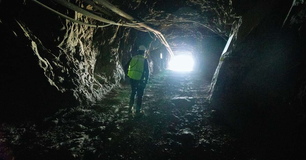 A person wearing a hard hat and high-visibility vest walks through a dark, rocky tunnel—common in the aggregate industry—toward a bright light at the end, with cables and wear parts lining the ceiling.