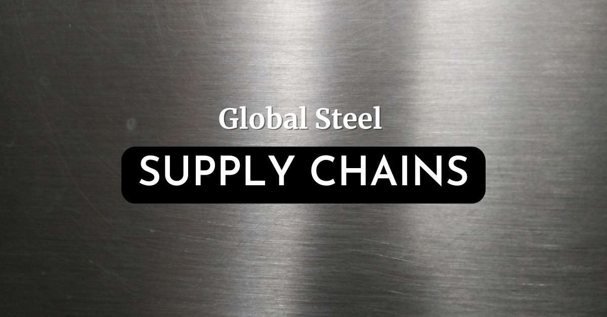 Text "Global Steel SUPPLY CHAINS" over a brushed metal background, evoking the theme of steel industry logistics and global supply networks.